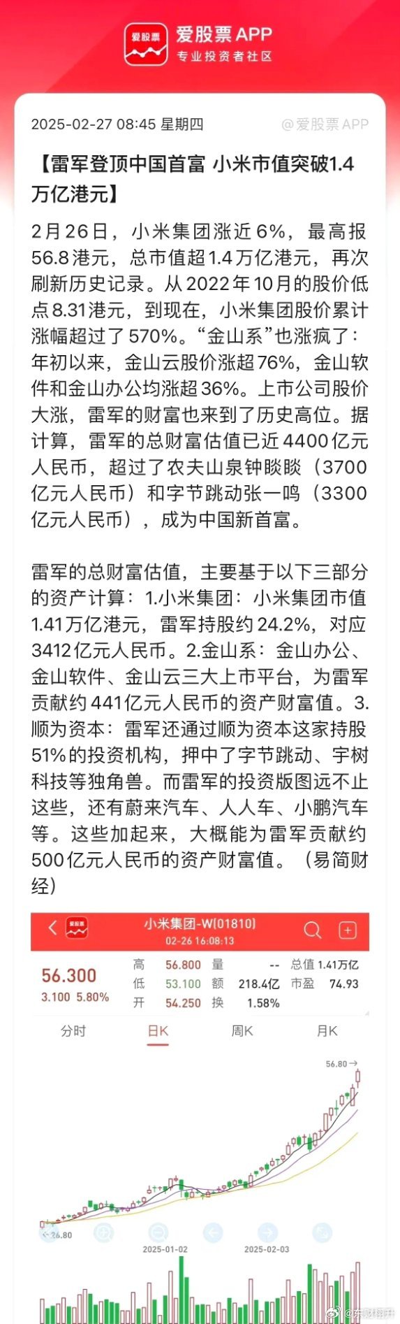 摘要:小米最新估值成為關(guān)注焦點(diǎn),同時(shí)也有一場(chǎng)尋找內(nèi)心平靜的綠色之旅正在進(jìn)行。這場(chǎng)旅程或許暗示著小米公司在追求商業(yè)價(jià)值的同時(shí),也在尋求一種內(nèi)心的平衡與和諧,以綠色的理念引領(lǐng)企業(yè)發(fā)展,展現(xiàn)其獨(dú)特的價(jià)值觀。關(guān)于小米的最新估值,具體細(xì)節(jié)有待進(jìn)一步揭曉。